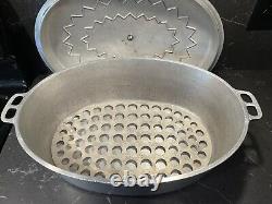 This 3 piece set includes a 10-quart Wagner Ware Sidney oval roaster Dutch oven with a lid and trivet perfect for cooking up delicious roasts, turkeys and stews. The aluminum material provides high heat resistance and the oval shape allows for more even cooking. With a stove type compatibility of both electric and gas, this roaster Dutch oven is versatile and can be enjoyed in any kitchen.